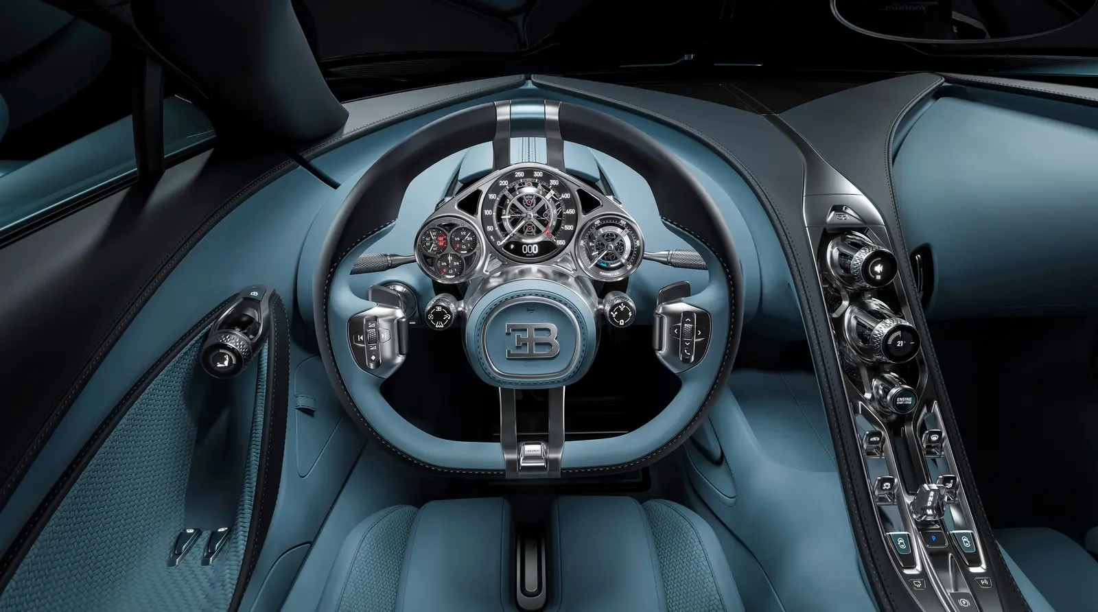 The Bugatti Tourbillon's interior showcases a watch-inspired analog instruments