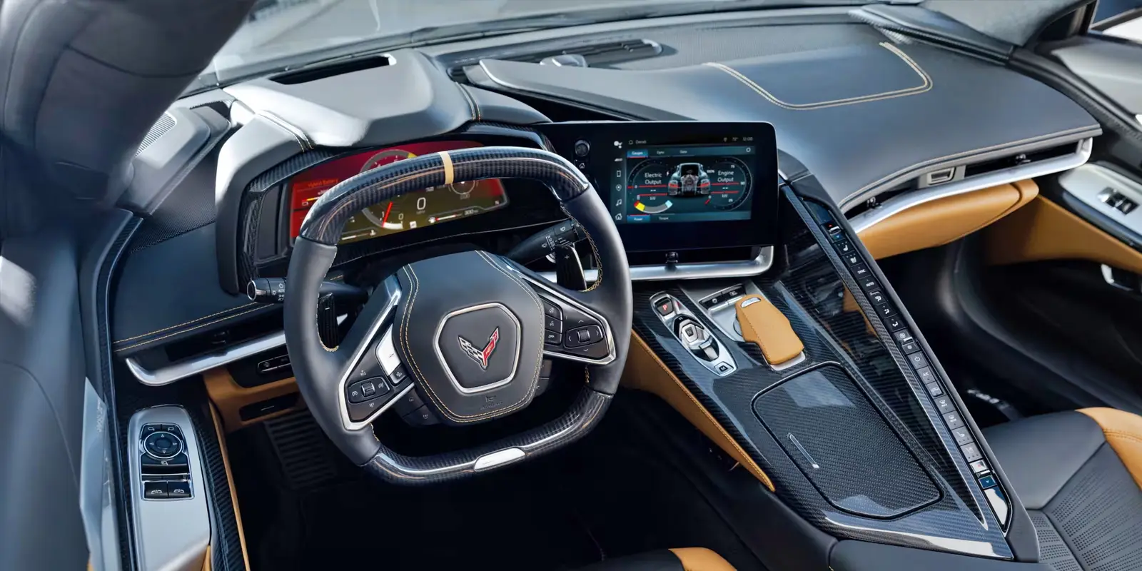 The Chevrolet Corvette E-Ray sports a very focused cockpit with a chunky center console running in between the seatsThere's a 12.3-inch driver's display, an 8.0-inch touchscreen infotainment display, leather seats, and an electronically adjustable steering wheel