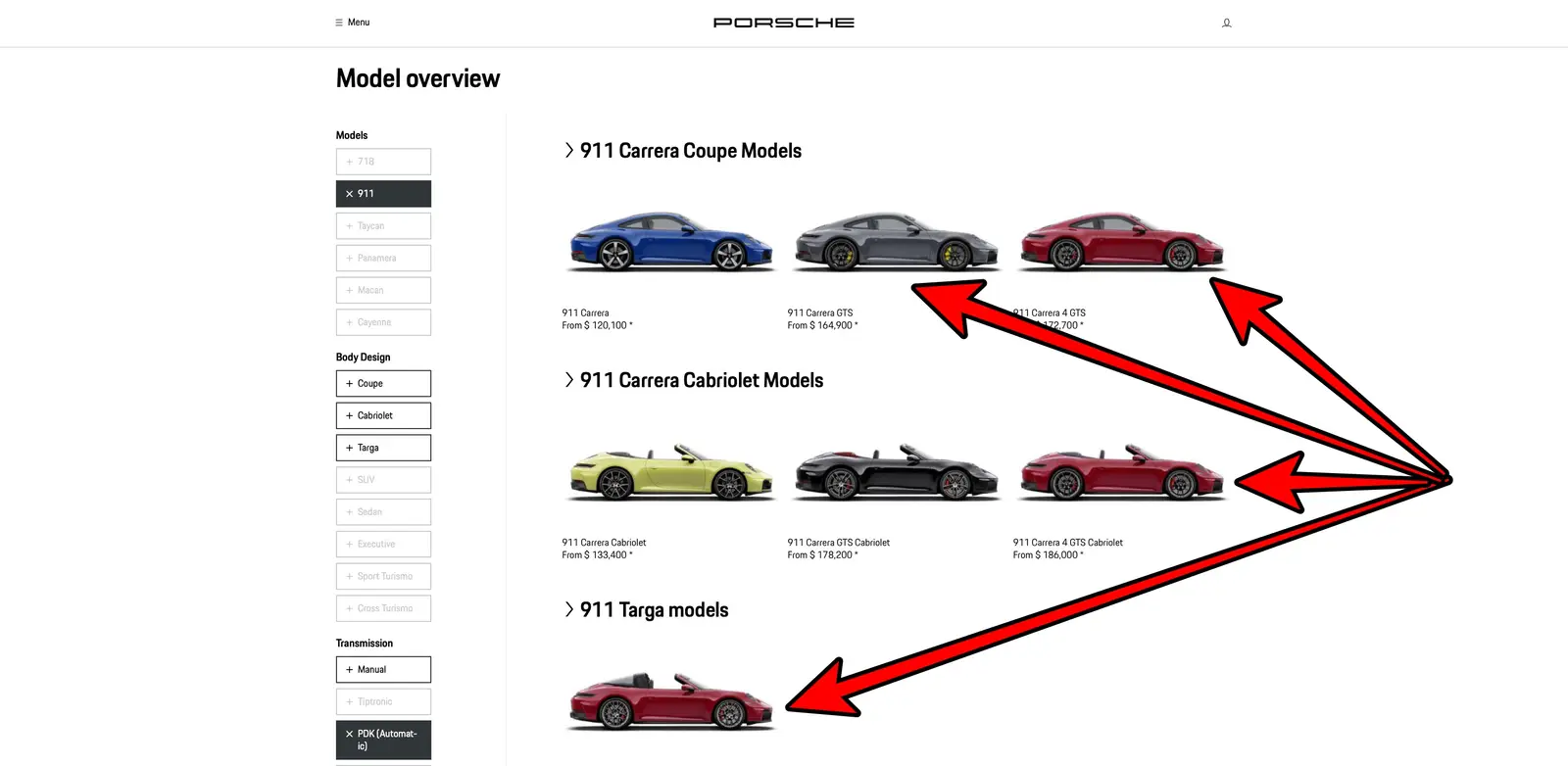 * Available in 4 flavors, coupe with RWD or AWD, cabriolet, and Targa body styles, the Porsche 911 Carrera GTS starts at $166,895, and carries a significant premium over the Corvette E-Ray that starts at $106,900