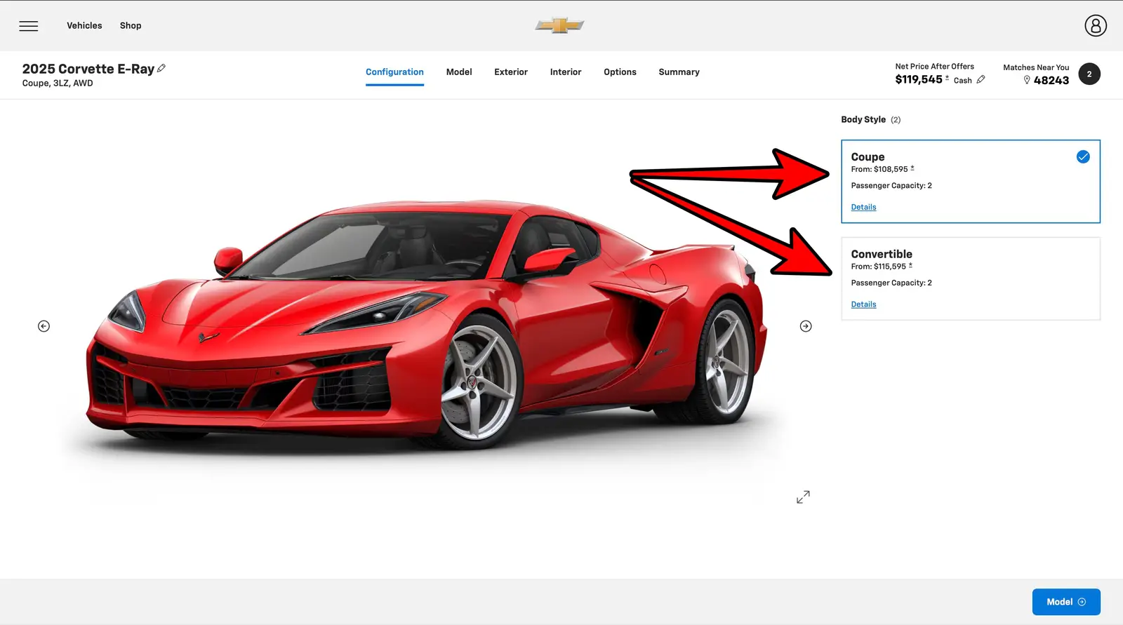 The Corvette is available either as a coupe or convertible across three trims, 1LZ, 2LZ, and 3LZ.
